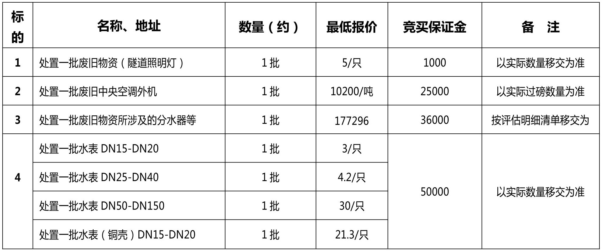 2、4号标的报名条件:①具有废旧物资回收、再生物资回收资质的企业或水表制造资质的企业。②竞买人在报名前需到转让方签订一份承诺书。4号标的竞买人在起拍价基础上报上浮比例(加价幅度为1%或1%的整数倍),上浮比例最高者为中拍者。3-4号标的看样联系人及电话:卢先生 15167188848。