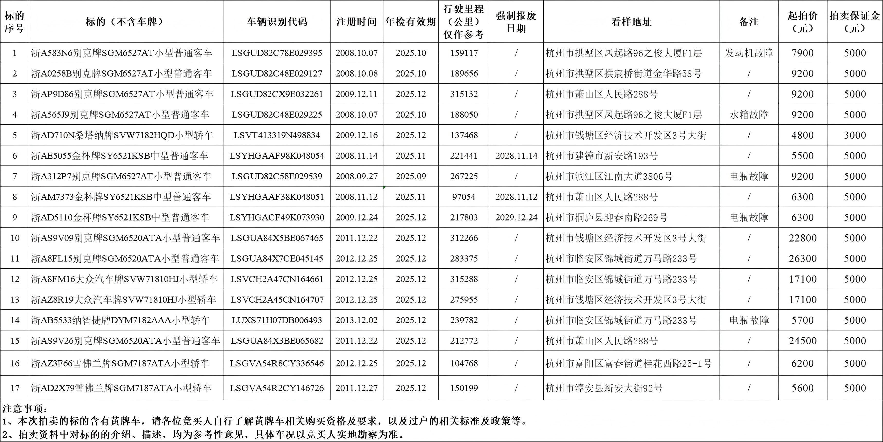 机动车17辆(不含车牌)单个拍卖,起拍价、拍卖保证金详见下表: